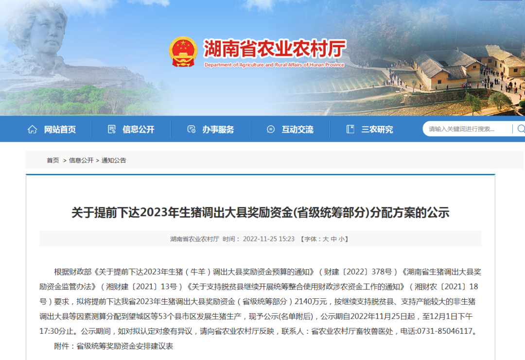 根據(jù)財(cái)政部《關(guān)于提前下達(dá)2023年生豬(牛羊)調(diào)出大縣獎(jiǎng)勵(lì)資金預(yù)算的通知》(財(cái)建〔2022〕378號(hào))《湖南省生豬調(diào)出大縣獎(jiǎng)勵(lì)資金監(jiān)管辦法》(湘財(cái)建〔2021〕13號(hào))《關(guān)于支持脫貧縣繼續(xù)開展統(tǒng)籌整合使用財(cái)政涉農(nóng)資金工作的通知》(湘財(cái)農(nóng)〔2021〕18號(hào))要求,擬將提前下達(dá)我省2023年生豬調(diào)出大縣獎(jiǎng)勵(lì)資金(省級(jí)統(tǒng)籌部分)2140萬元,按繼續(xù)支持脫貧縣、支持產(chǎn)能較大的非生豬調(diào)出大縣等因素測(cè)算分配到望城區(qū)等53個(gè)縣市區(qū)發(fā)展生豬生產(chǎn),現(xiàn)予公示(名單附后),公示期自2022年11月25日起,至12月1日下午17:30分止。公示期間,如對(duì)擬認(rèn)定對(duì)象有異議,請(qǐng)向省農(nóng)業(yè)農(nóng)村廳反映,聯(lián)系人:省農(nóng)業(yè)農(nóng)村廳畜牧獸醫(yī)處,電話:0731-85046117。河南省省級(jí)統(tǒng)籌獎(jiǎng)勵(lì)資金安排建議表