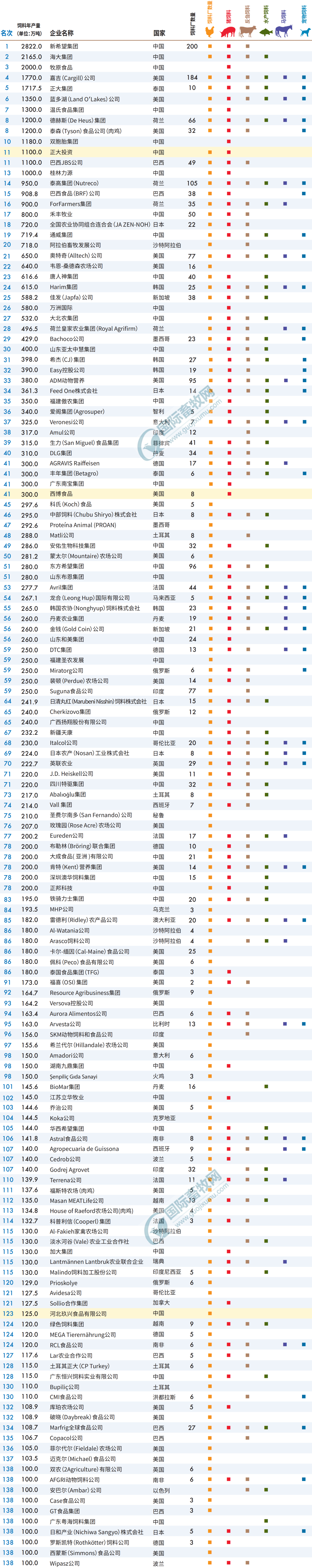 近日,WATT國際傳媒發(fā)布全球頂尖飼料企業(yè)排行榜,榜單顯示,2022年全球147家飼料產(chǎn)量超過5.38億噸,占全球飼料產(chǎn)量的43%,上榜企業(yè)飼料年產(chǎn)量均超過100萬噸。